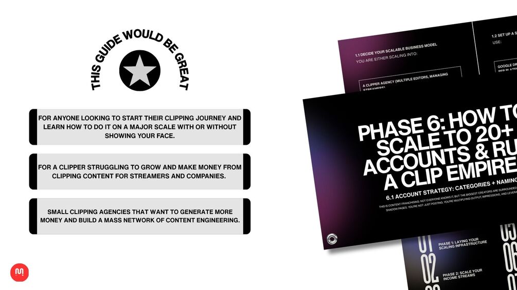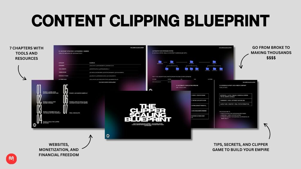 THE CLIPPER SCALING BLUEPRINT™ is a detailed, insider-packed digital download designed to help you scale as a content clipper — turning your skills into a multi-income machine, managing 20+ accounts, hiring a team, building clip farms, and creating your own content media brand from scratch.